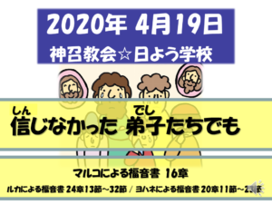 ・・・というわけで、4月12日イースターより、牧師権限(?)で勝手に命名: 「おうちで日曜学校プロジェクト」をスタートしています。毎週日曜日8:55分配信。